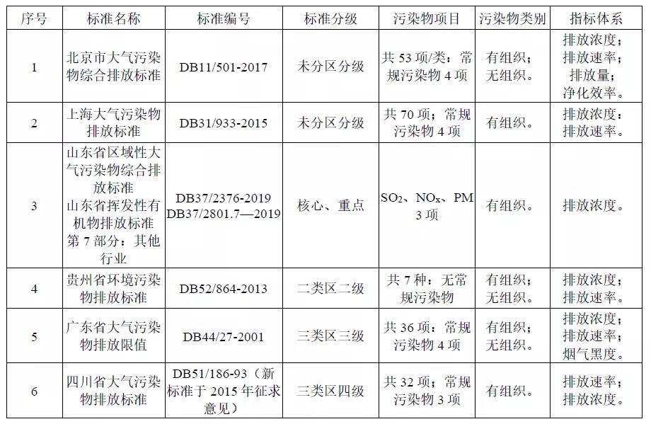 国家大气污染物综合排放标准(GB16297-1996)发布于1996年,1997年开始实施,标准较老,标准限值均较松。全国已有广东省、山东省、贵州省、四川省等省份均已制定了地方综合排放标准,如下表所示。